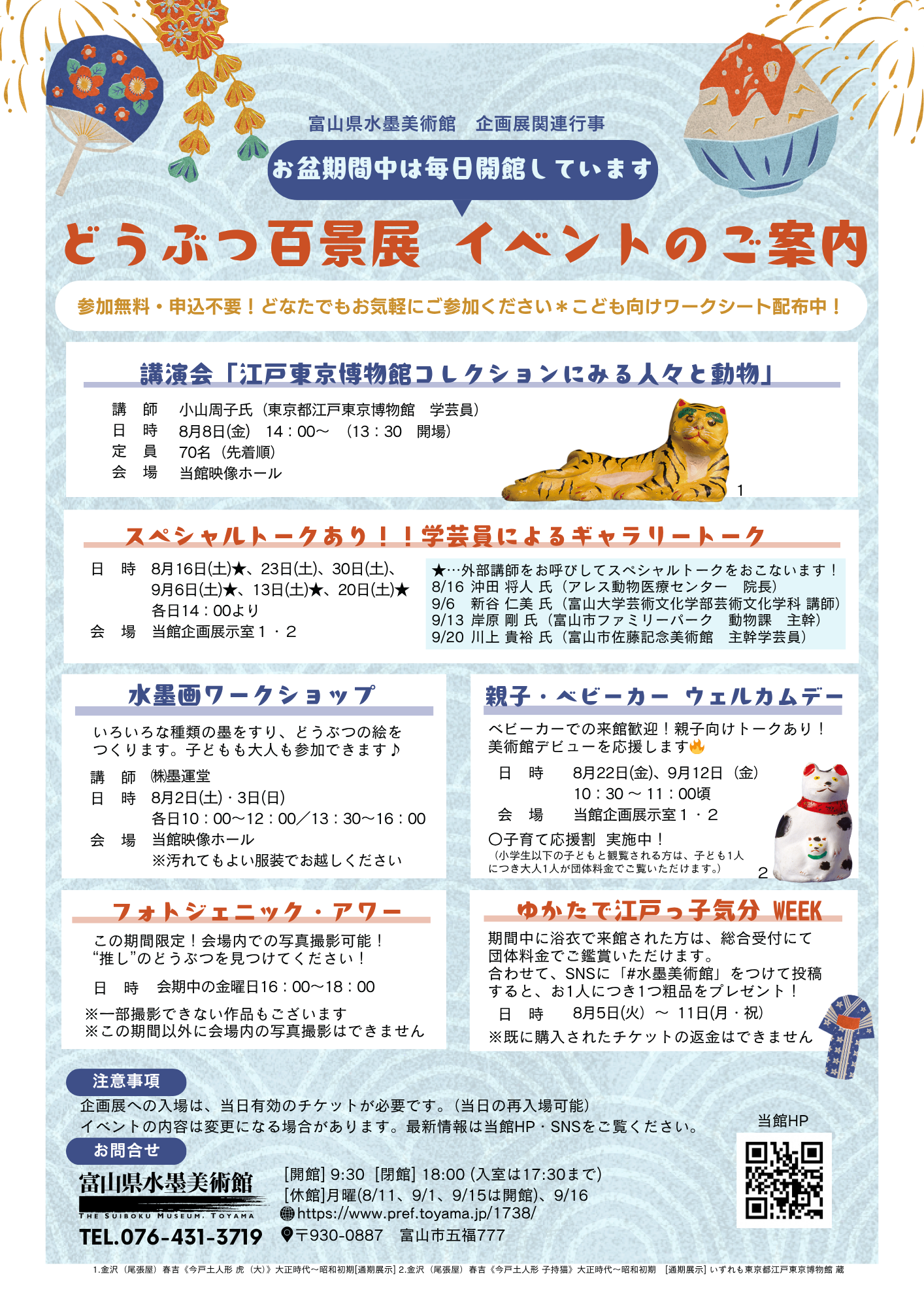 好評開催中の企画展「どうぶつ百景―江戸東京博物館コレクションより」では、たくさんの関連イベントを実施します。またお盆期間には茶室「墨光庵」も臨時営業します。ぜひご家族そろってお越しください。