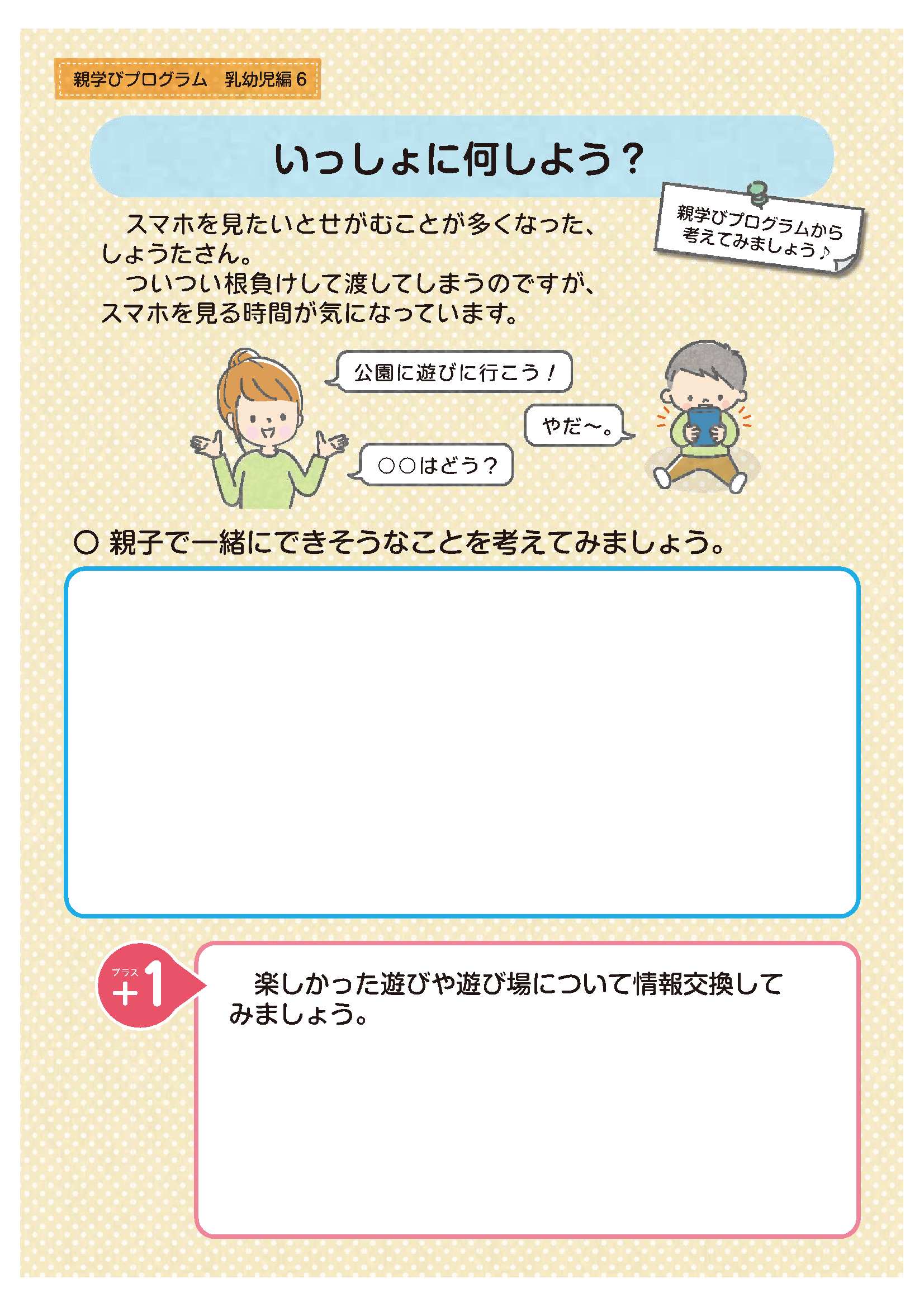 子育てによくある身近な出来事をもとにした「親学びプログラム」を作成しました。短時間での話合いに活用できる「ちょこっと親学び」※もあります。市町村での子育て事業、子育てサークルやPTAの学習会、学習参観や学年懇談会等、さまざまな場面でご活用ください。 ※「ちょこっと親学び」・・・短時間での話合いに活用できるプログラムショート編のことです。