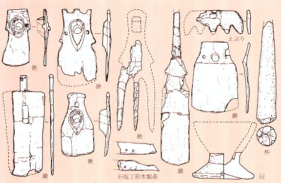 石製農具としては石庖丁があります。長さ15cm前後の半月形で中央に2個の穴があけられた穂つみ具です。現代の稲刈りと違い,実った稲から順に何日もかけて穂をつみとっていきました。